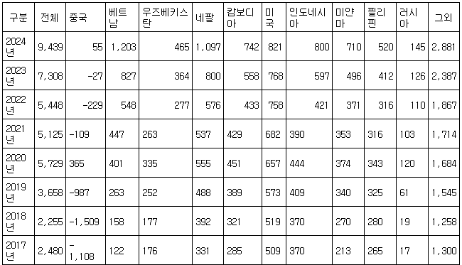 국가별 흑자를 살펴보면 베트남(1천203억원), 네팔(1천97억원), 미국(821억원), 캄보디아(742억원) 등 대부분 국가에서 상당한 규모의 흑자를 기록해 전체 재정 건전성에 기여했다.