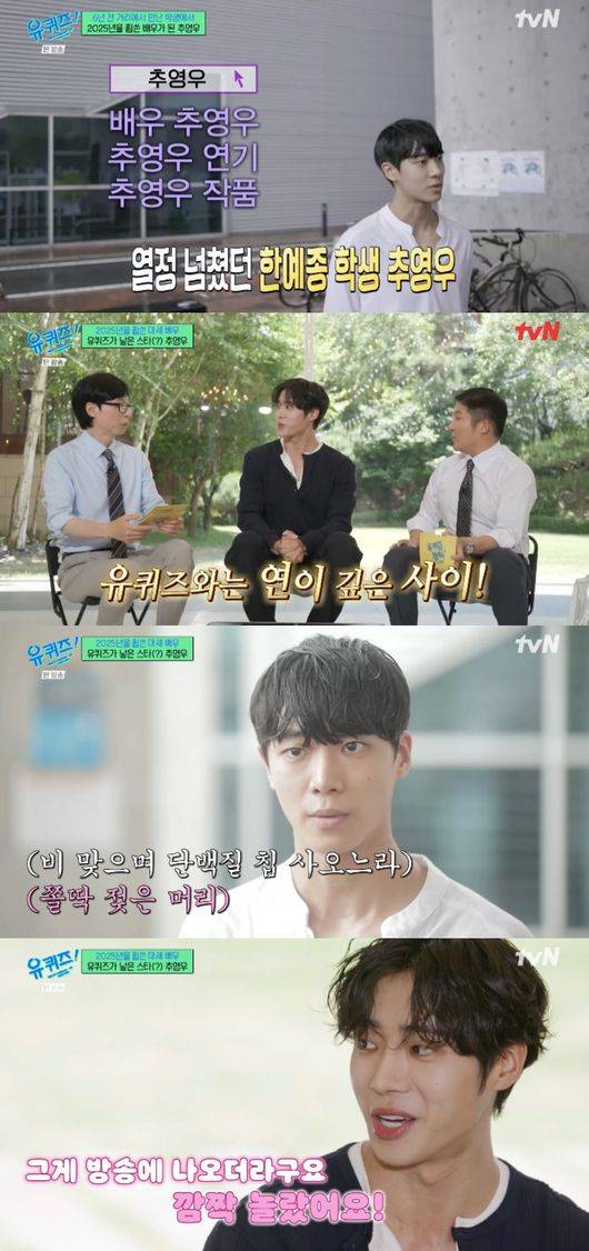 6년 전 한예종 학생에서 대세 배우가 돌아온 추영우의 등장에 유재석은 "최근에 백상 시상식 때 인사했습니다만 추영우 씨는 유퀴즈와 인연이 있다. 한예종 학교 다닐 때 유퀴즈 인터뷰 한 적 있는데 어떻게 된 거냐"라고 물었다.