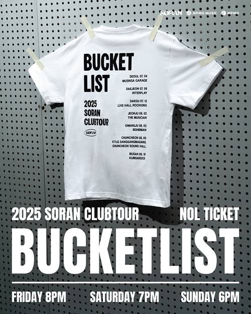 소란의 전국 클럽 투어 ‘버킷리스트’ 예매는 NOL 티켓을 통해 6월 16일 서울 공연 오픈, 이후 각 지역 공연이 순차적으로 예매를 시작할 예정이다. 소란은 “늘 다시 오겠다고 약속했지만 실현하지 못했던 지역 팬들을 드디어 만나게 되어 기쁘다”며, “이번 투어가 팬들과 함께 만들어가는 버킷리스트의 실현이 되길 바란다”고 소감을 전했다. 한편, 소란은 지난 4월 디지털 싱글 ‘너의 등장’ 발매를 시작으로 활발하게 대중과 소통 중이다.