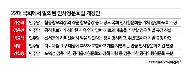 문제는 당리당략에 따라 인사청문제도에 대한 입장이 바뀌다 보니 여야 합치로 개정안을 통과시키기가 힘들다는 점이다. 실제 박근혜 정부 때 발의된 44개 법안 중 33개를 민주당 등 야당이, 문재인 정부 때 발의된 68개 발의된 법안 중 50개를 국민의힘 등 야당이, 윤석열 정부 때 발의된 34개 법안 중 29개를 민주당 등 야당이 발의하는 등 두 거대 정당은 여당일 때와 야당일 때 확연히 다른 적극성을 보였다.