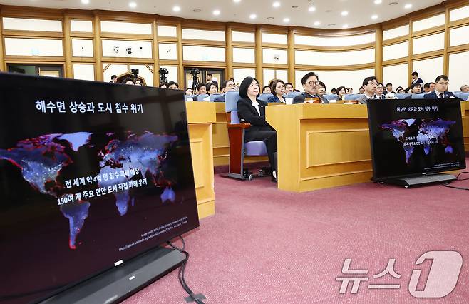 (서울=뉴스1) 김민지 기자 = 우원식 국회의장이 19일 오전 서울 여의도 국회 의원회관에서 열린 '국회 최고위 - 기후위기와 인구위기'에서 기후위기로 인해 발생하는 문제점을 담은 자료를 보고 있다. 2025.6.19/뉴스1