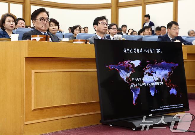 (서울=뉴스1) 김민지 기자 = 우원식 국회의장이 19일 오전 서울 여의도 국회 의원회관에서 열린 '국회 최고위 - 기후위기와 인구위기'에서 기후위기로 인해 발생하는 문제점을 담은 자료를 보고 있다. 2025.6.19/뉴스1