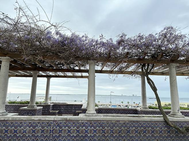 ▲ 등꽃 너머 바다 수평선에 트로이아 반도가 보인다.