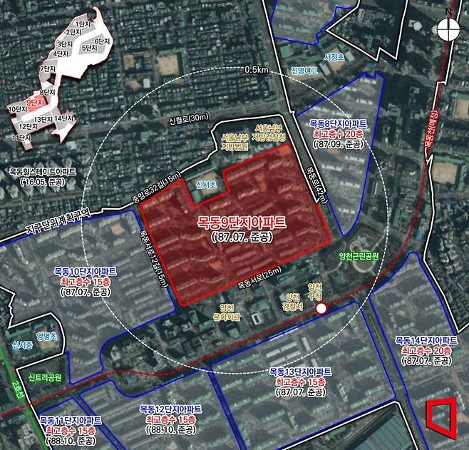 목동9단지는 재건축 후 최고 49층으로 아파트 3957가구(임대 620가구 포함)로 재탄생한다. 9단지는 1987년 준공된 최고 15층, 34개동·2030가구 규모다. 9단지는 반경 1㎞ 내 5호선 목동역, 2호선 신정네거리역, 양천구청역이 위치해 교통 여건이 뛰어나다. 남측으로는 양천구청, 양천경찰서가 있고 북측으로는 신서초등학교가 있다.