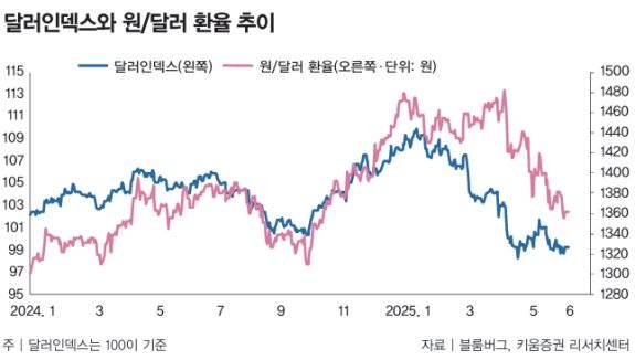 첫째, 미국달러의 약세 전환이다. 지난해 미국달러는 미국의 상대적 경기 우위, 이른바 '미국 예외주의'에 힘입어 강세를 보였다. 하지만 올해 들어 도널드 트럼프 행정부의 관세정책과 관련한 불확실성이 확대되면서 달러인덱스(주요 6개국 통화 대비 미국달러화 가치)가 연초 대비 9% 이상 하락했다. 관세정책에 대한 우려가 미국 경제의 성장세 둔화를 자극하고, 관세 인상에 따른 수입물가 상승이 인플레이션 압력을 높이면서 스태그플레이션(고물가 속 경기침체) 가능성까지 불러일으킨 결과다. 이는 미국달러에 대한 투자심리를 약화하는 주요 요인으로 작용했다.국제신용평가사 무디스가 5월 미국 신용등급을 기존 Aaa에서 Aa1으로 한 단계 하향 조정하며 미국 자산 신뢰도에 의문을 제기한 것도 미국 국채금리에 상승 압력을 가해 달러 약세 요인으로 작용했다.