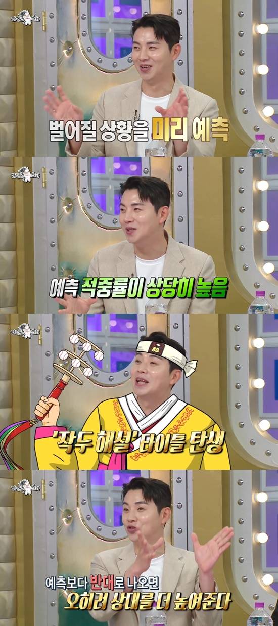 상황을 관찰한 뒤 다음 전략을 미리 예측을 하는 것에 대한 적중률이 높다는 그는 '작두 해설' 타이틀을 얻었다면서 "요즘 트렌드가 다른 해설위원들도 예측을 많이 하려고 한다. 그런데 (예측이) 잘못됐을 때 빨리 포장하는 능력도 있어야 한다"며 "예측과 반대로 나오면 오히려 상대를 더 높여준다. 그런 능력이 있어야 해서 무작정 따라하면 쉽지 않다"고 이야기했다.
