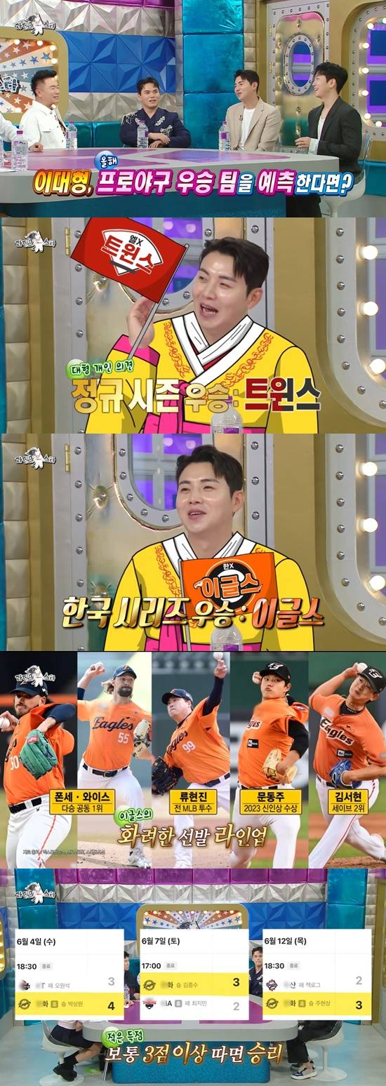 이에 유세윤이 올 시즌 프로야구 우승팀을 예측해달라고 하자 이대형은 "해설위원들이 가장 조심스럽게 접근하는 부분인데, 어차피 제 생각이니까"라면서 "정규시즌은 LG 트윈스가 우승을 하고, 한국시리즈에서 한화 이글스와 LG가 붙으면 한화가 우승할 것"이라고 예측했다.