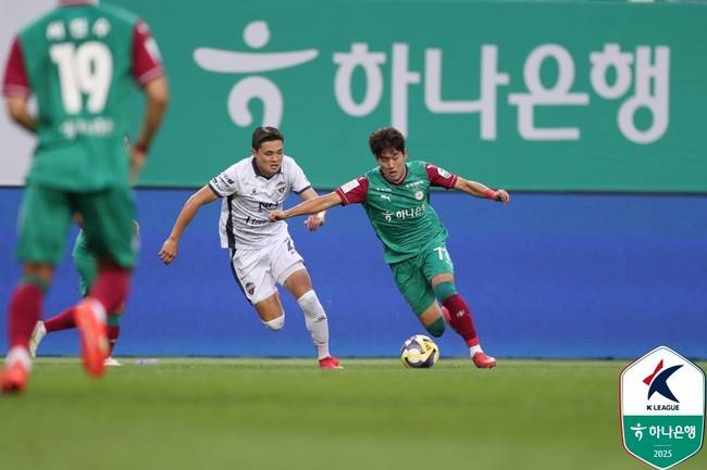 대전하나시티즌과 김천 상무는 18일 오후 7시 30분 대전월드컵경기장에서 열린 '하나은행 K리그1 2025' 19라운드에서 0-0으로 비겼다. 대전은 승점 33을 얻어 2위에 올라있다. 1위 전북 현대와 승점 8 차이다.