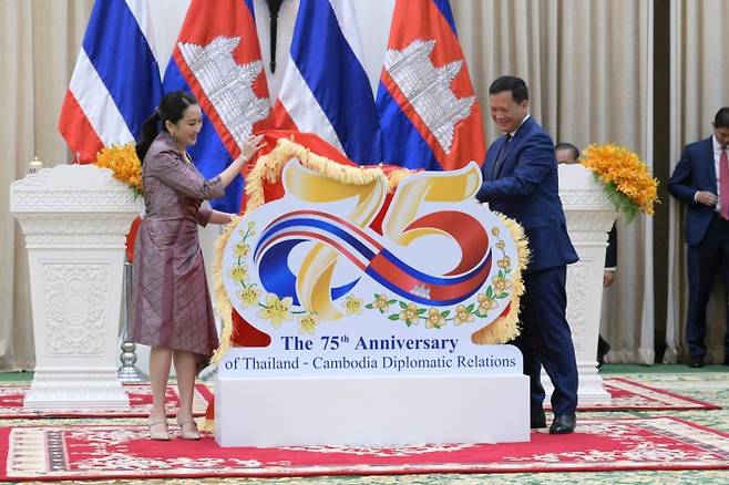 | ▲ 지난 5월 24일 파에통탄 친나왓 총리와 훈 마넷 캄보디아 총리가 프놈펜 평화궁에서 양국 수교 75주년을 기념하는 모티브를 공개하고 있다. |