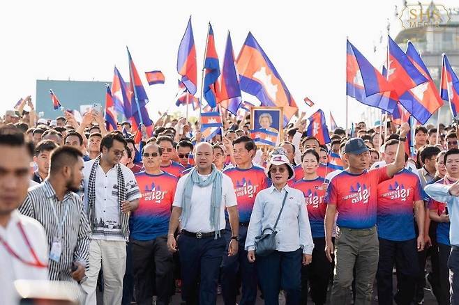 | ▲ 수도 프놈펜 시내 중심 꼬픽섬에서 지난 18일 열린 크메르 민족 시가행진 대회에 참여한 캄보디아 시민들의 모습. 캄보디아 현지언론들은 약 15만 명의 시민과 학생들이 참가했다고 밝혔다. |