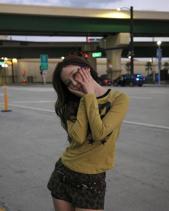 윈터는 허리라인을 감싸는 롱슬리브와 마이크로한 핏의 호피 팬츠를 함께 매치했다. 상하의 모두 타이트하고 크롭한 핏감, 강렬한 색감과 패턴의 아웃핏으로 힙한 무드를 연출했다.