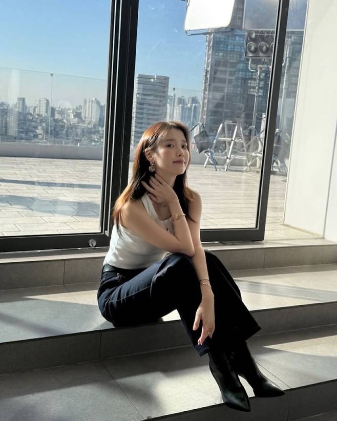 아이유는 서로 색상이 대비되는 화이트 슬리브리스 상의와 진청색 데님 팬츠를 매치했다. 일반적으로 착용하는 얇은 어깨선이 들어간 제품 대신 남성복처럼 선이 굵은 슬리브리스를 선택, 중성적인 분위기를 뽐내며 데님이 주는 무드를 강조했다. 여기에 진과 어우러지는 부츠를 매치해 성숙하면서도 자유로워 보이는 독특한 느낌을 더했다.