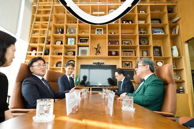 | ▲ 유상임 과학기술정보통신부 장관이 19일 오전 서울 중구 글로벌녹색성장기구(Global Green Growth Institute, GGGI) 본부에서 열린 '기후변화대응을 위한 공공기후기술 확산에 관한 양해각서 체결식'에 참석해 김상협 글로벌녹색성장기구 사무총장과 대화를 나누고 있다. |