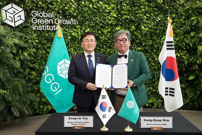 | ▲ 유상임 과학기술정보통신부 장관과 김상협 글로벌녹색성장기구 사무총장이 19일 오전 서울 중구 글로벌녹색성장기구(Global Green Growth Institute, GGGI) 본부에서 열린 '기후변화대응을 위한 공공기후기술 확산에 관한 양해각서 체결식'에서 기념촬영을 하고 있다. |
