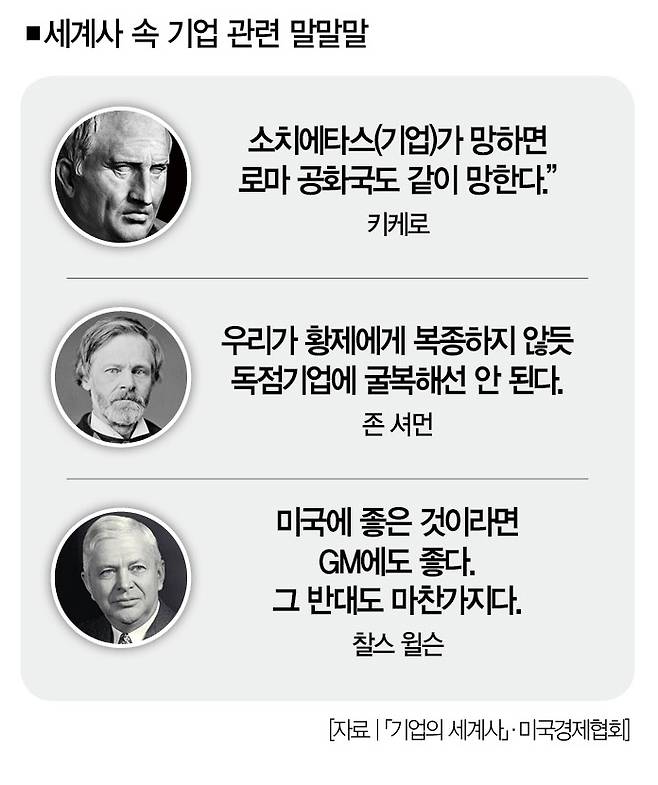 텍사스 주립 A&M대학에서 회사법을 가르치는 윌리엄 매그너슨 교수는 「기업의 세계사(한빛비즈·2024년)」라는 책에서 지금의 상식을 이렇게 꼬집는다. "기업은 오로지 이익 추구라는 목적을 달성하기 위해 존재하는 영혼 없는 독립체라고 생각하는 사람들이 많다. 더 나아가 이익 추구는 당연하고 그것이 기업의 의무라고 생각하는 사람도 있다. 하지만 이런 생각은 모두 틀렸다. 기업은 원래 공공선을 함양할 목적으로 만들어진 조직이다(16쪽)."