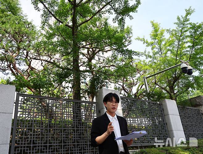 [서울=뉴시스] 박주성 기자 = 백해룡 경정 법률대리인인 이창민 변호사가 19일 서울 서초동 대검찰청 앞에서 마약 수사 외압 사건 검찰 수사 무마 의혹 관련 증거 공개와 설명을 하고 있다. 2025.06.19. park7691@newsis.com