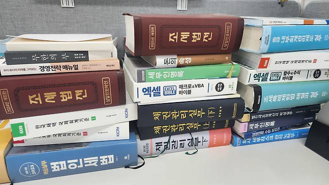 | ▲ 책상 위에 쌓인 업무 관련 서적들. |