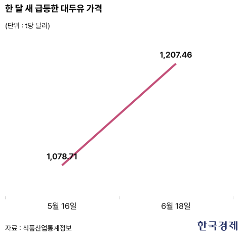 대두유 원료인 대두 가격도 움직이고 있다. CME에서 거래되는 대두 가격은 전날 기준 t당 394.9달러로 한달새 2%가량 올랐다.