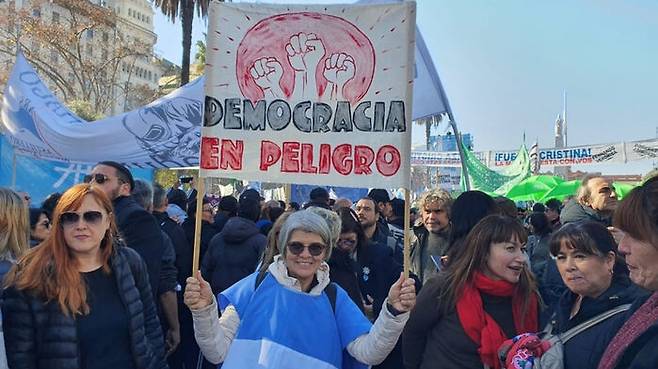 ▲ 크리스티나 페르난데스 전 아르헨티나 대통령의 지지자인 사라(54)가 '민주주의가 위험하다'란 팻말을 들고 있다.