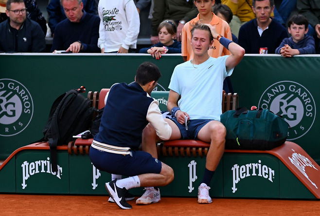 지난 롤랑가로스 경기 중 다리에 치료를 받고 있는 코르다