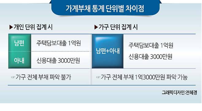 각각 빚이 있는 경우도 마찬가지다. 남편이 주택담보대출 1억원, 아내가 신용대출 3000만원이 있다고 할 때 현행 통계로는 가계가 얼마큼의 부채를 감당하고 있는지 파악할 수 없다. 가구 단위의 DB가 갖춰진다면 1억3000만원이라는 가계 전체의 부채를 정확히 간파할 수 있게 된다.