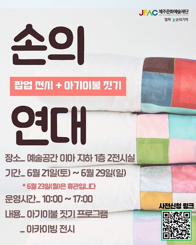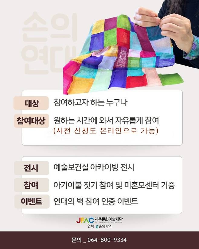 제주문화예술재단(이사장 김석윤, 이하 재단)은 오는 6월 21일부터 29일까지 커뮤니티 아트 프로젝트 '손의 연대'를 제주시 삼도2동에 위치한 예술공간 이아에서 운영한다.