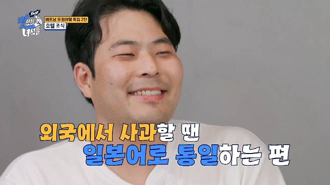 문세윤은 "김해준이 좀 전에 뷔페에서 실수로 주걱을 떨어뜨리곤 직원에게 '하이 스미마셍'이라고 사과했다"라고 밝힌다. 이어 "'이유를 물어보니 해외여행을 일본밖에 안 가봐서 일본어가 먼저 나온다며 머쓱해하더라"라며 전하며 김해준의 허당미를 언급해 웃음을 자아낸다.