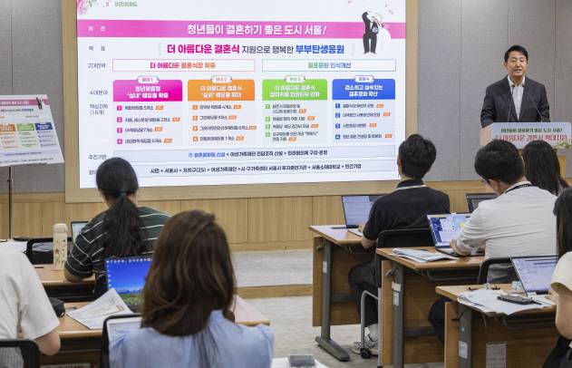 [오세훈 서울시장이 19일 서울 중구 서울시청에서 열린 공공시설을 활용한 '더 아름다운 결혼식' 확대 지원 계획 브리핑에 참석해 추진 사업에 대해 발표하고 있다. (사진=연합뉴스)]