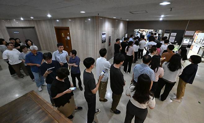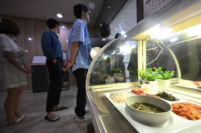 외식 물가가 연일 상승하고 있는 19일 서울 종로구 종로구청 구내식당에서 이용객들이 줄을 서고 있다.