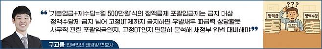 위 둘째와 관련하여서는, 이것이 포괄임금제의 유형 중 정액수당제를 금지하는 내용임에는 다툼이 없어 보인다. 다만 나아가 고정OT 제도까지 금지하는 것인지는 향후의 입법 추이를 지켜보아야 한다. 만약 고정OT 제도까지 금지하는 취지로 입법이 이루어진다면, 현재 국내 사업장 중 상당부분이 사무직에 대하여 고정 OT 제도를 도입하고 있기에, 입법으로 인한 금지의 범위와 우발채무의 파급력이 상당할 것으로 예상된다.