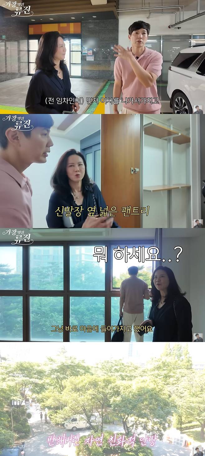 특히 문을 열고 집에 들어서자 넓은 현관과 팬트리가 눈에 띄었다. 그리고 곧바로 안방이 나왔는데, 초록색 뷰가 펼쳐진 넓은 통창을 보며 류진의 아내는 "정원 뷰가 너무 좋았다. 다시 아파트로 안 오려다가 저층이 딱 나온 거다. 그래서 잠깐 밖에 정원 뷰만 보고 바로 마음에 들어서 했다"라고 말했다.