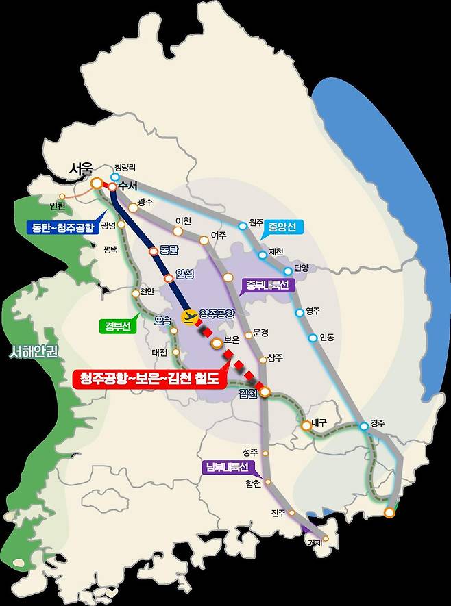 청주공항~김천 철도가 국토교통부의 제5차 철도망계획에 포함된다면 수서~동탄~안성~충북혁신도시~청주공항~보은~김천~부산 노선이 건설된다.