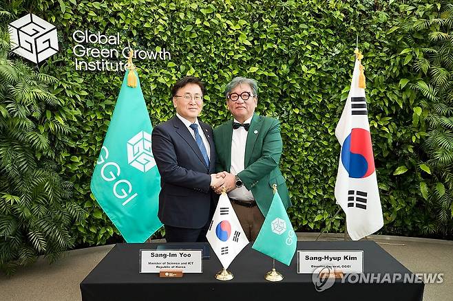 (서울=연합뉴스) 유상임 과학기술정보통신부 장관과 김상협 글로벌녹색성장기구 사무총장이 19일 서울 중구 글로벌녹색성장기구 본부에서 열린 '기후변화대응을 위한 공공기후기술 확산에 관한 양해각서 체결식'에서 기념 촬영하고 있다. 2025.6.19 [과학기술정보통신부 제공. 재판매 및 DB 금지]