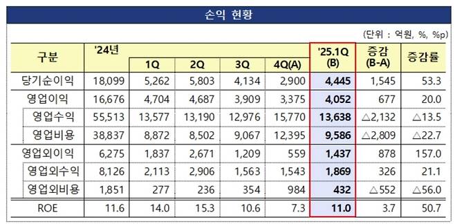 올해 1분기 자기자본이익률(ROE)는 11.0%를 기록해 지난해(11.6%) 보다 0.6%포인트 감소했다.