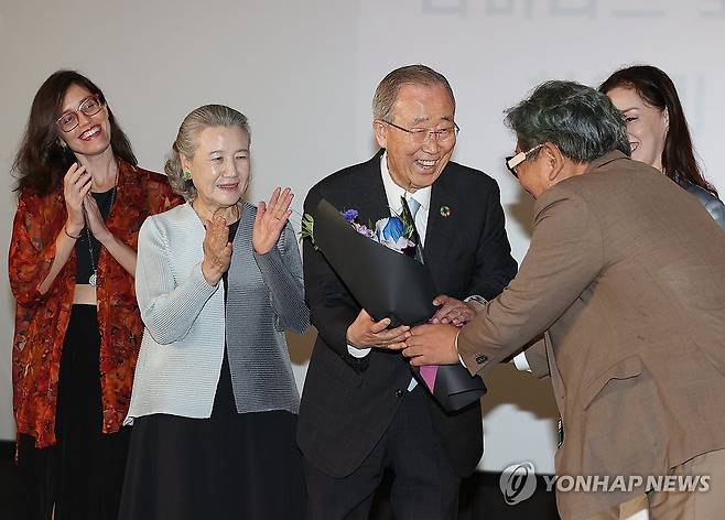 (서울=연합뉴스) 이재희 기자 = 반기문 전 유엔 사무총장이 19일 서울 용산구 CGV 아이파크몰점에서 열린 다큐 영화 '조용한 리더' 시사회에서 한 참석자에게 꽃다발을 받고 있다. 2025.6.19