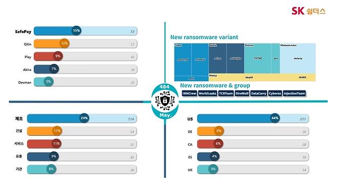 SK쉴더스의 사이버 위협 분석 보고서 'EQST 인사이트(Insight)'에 따르면, 지난 5월 전 세계 랜섬웨어 피해 건수는 484건에 이른다. SK쉴더스는 전월(550건) 대비 12% 줄었지만, 주요 랜섬웨어 소스코드 유출로 변종 랜섬웨어가 발생했으며 신규 조직이 등장하는 등 랜섬웨어 위협은 여전히 크다고 분석했다.