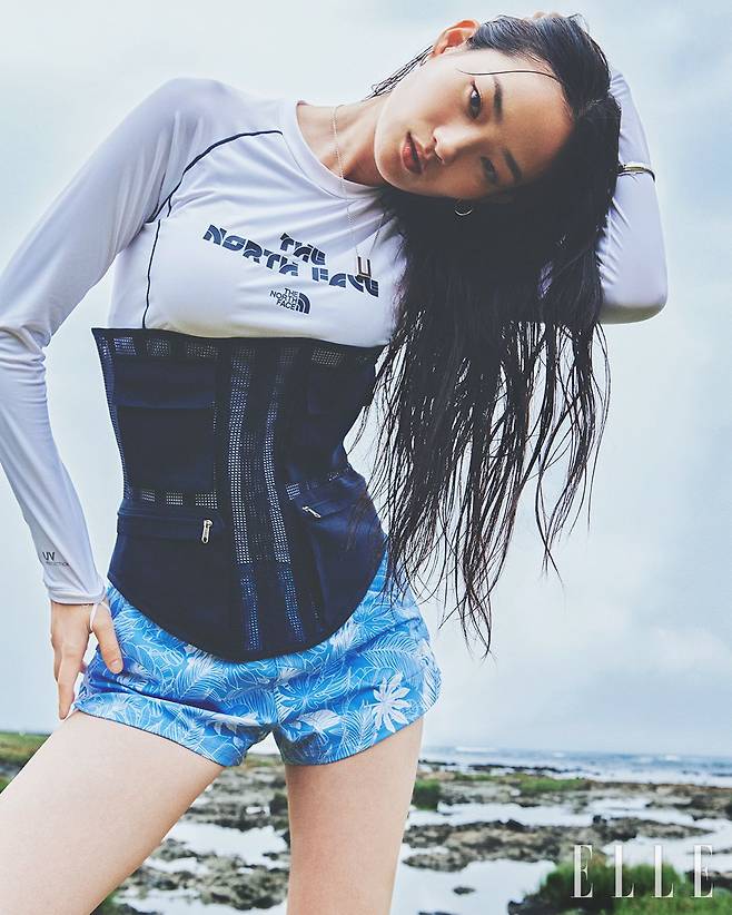 서퍼 롱 슬리브 래시가드는 8만9천원, 선라이즈 쇼츠는 8만9천원, 모두 The North Face. 코르셋은 Egnarts. 이어링과 네크리스는 모두 TomWood.