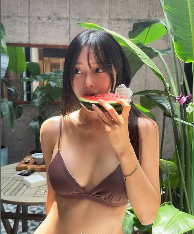 사진 속 이솔이는 구릿빛 피부에 브라운 컬러 비키니를 입고 수박을 먹으며 늘씬하고 핫한 몸매를 과시했다.