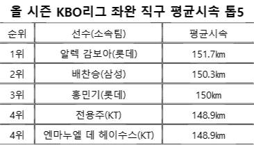 감보아의 첫째 매력은 역시 구속이다. 지난 4경기 데이터를 분석한 결과, 직구 최고시속은 157㎞로 기록됐다. 놀라운 대목은 평균시속으로 무려 151.7㎞다. KBO리그 평균인 144㎞를 크게 웃도는 수치다. 분당 회전수도 뛰어나 평균 2500rpm으로 전체 평균인 2200rpm을 상회한다. 까다로운 좌완, 그것도 선발투수가 이렇게 빠른 공을 오랫동안 던지니 이를 상대하는 타자들은 애를 먹기 일쑤다. 영입 과정까지만 하더라도 제구가 흔들린다는 평가가 있었지만, 막상 뚜껑을 열어보니 이마저도 흠잡을 곳이 없다.