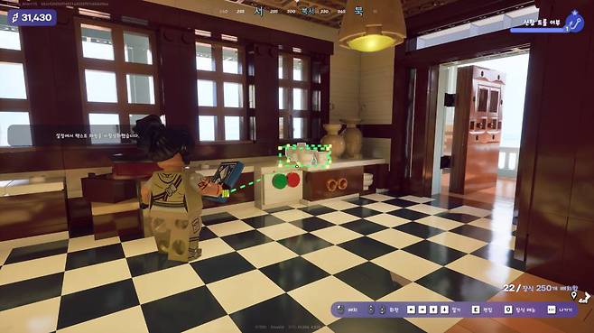 그중에서도 가장 흥미로웠던 요소는 집 꾸미기(주거지) 기능이다. 이용자는 월드 내의 빈 집터 중 하나를 선택해 프리셋으로 제공되는 기본 집을 설치할 수 있다. 처음 설치된 집 내부는 비어 있는 상태이며, 게임 내 재화인 ‘크레딧’을 소모해 구입한 소품들로 자유롭게 내부를 꾸밀 수 있다.