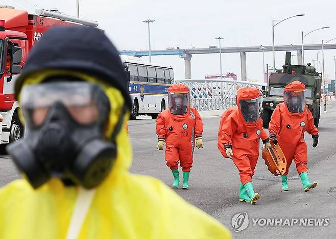 (평택=연합뉴스) 홍기원 기자 = 19일 경기도 평택시 포승읍 평택당진항 국제여객터미널에서 인질ㆍ화학 테러 상황을 가정한 대테러 관계기관 합동훈련이 진행되고 있다.