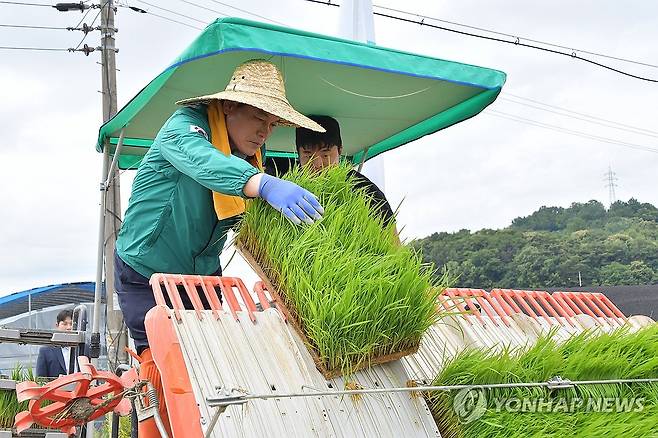 (담양=연합뉴스) 정철원 전남 담양군수가 19일 오전 담양군 월산면에서 열린 '2025 통일 쌀 모내기 행사'에 참여해 직접 모를 심고 있다. 전국 농민회는 쌀을 재배한 수익금을 남북통일 기금으로 기탁하고 있다. 2025.6.19 [담양군 제공. 재판매 및 DB 금지]