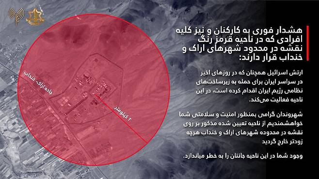 이 게시글에서 이스라엘군은 "아라크 주변의 주민, 노동자, 현재 체류자들에게 긴급 경고를 발령한다. 이란 정권의 군사 시설물을 타격하기 전에 즉각 대피하라. 이 지역에 머무는 경우 생명이 위험하다"고 밝혔습니다.