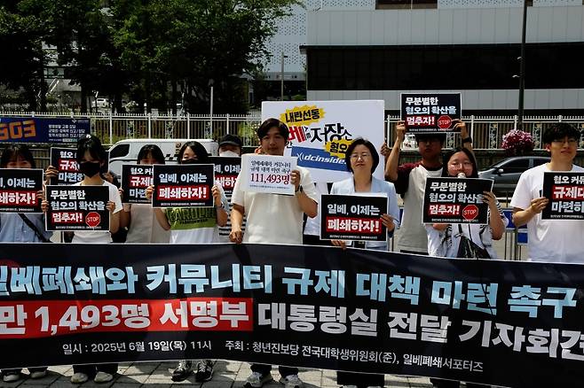 서울 용산 대통령실 앞에 모인 대학생들이 극우 성향의 사이트 '일베'를 폐쇄하고 커뮤니티 규제 대책을 마련해 달라며 구호를 외쳤다.