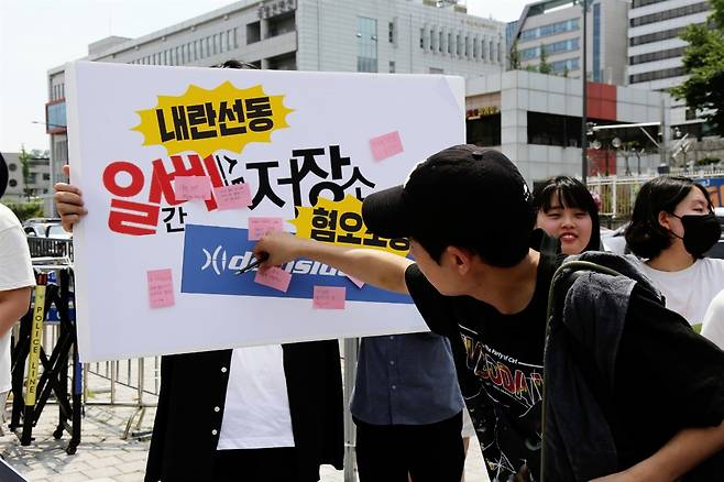 | ▲ 19일 오전 11시, 진보당 정혜경 의원과 청년진보당 전국대학생위원회, 일베폐쇄 서포터즈 소속 대학생과 청년들이 서울 용산 대통령실 앞에서 일베 사이트 폐쇄를 촉구하고 있다. |