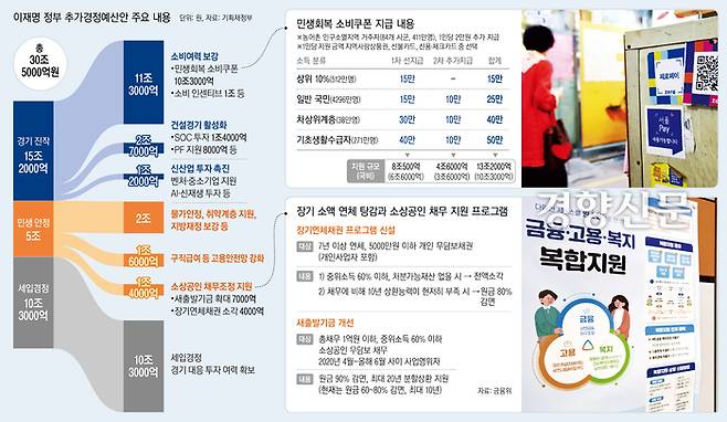정부가 장기간 침체된 내수를 살리기 위해 총 30조원 규모의 2차 추가경정예산안(추경) 편성을 19일 발표했다. 고소득층 제외 없이 전국민에게 소득에 따라 15만~50만원의 소비쿠폰을 차등지급하고, 정부 재원으로 오랜 기간 소액 연체된 113만명의 빚 16조원 가량을 탕감해준다. 정부는 이번 추경으로 올해 경제 성장률을 0.1%포인트 끌어올릴 수 있을 것으로 예측했다.