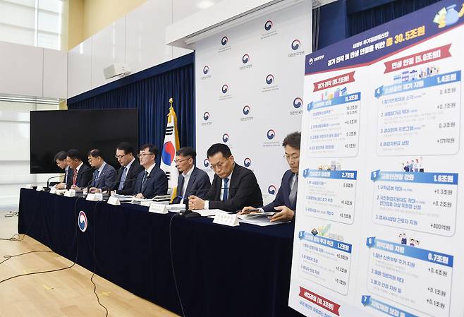 | ▲ 정부는 19일 30조5000억 원 규모의 새 정부 추가경정예산을 발표했다 사진은 지난 18일 오후 정부세종청사 중앙동에서 열린 '새정부 추가경정예산안 상세 브리핑' 장면. |