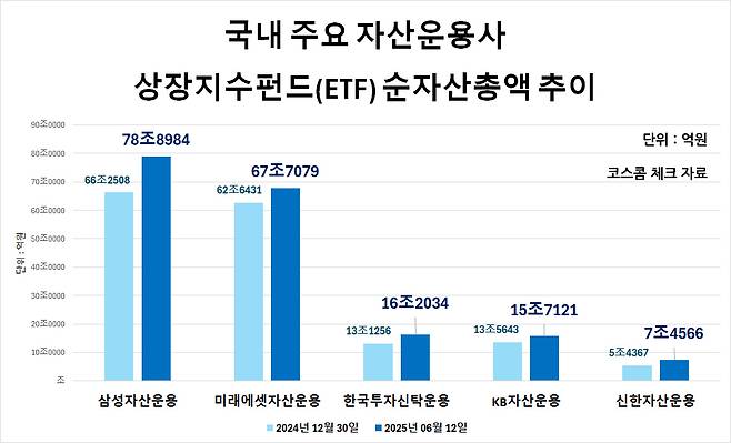 19일 헤럴드경제는 코스콤 체크를 활용해 국내 자산운용사별 ETF 순자산총액 규모를 비교 분석했다.