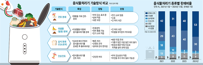 음식물처리기는 2013년 정부가 음식물쓰레기 종량제를 시행하며 조명받았다. △건조분쇄 △습식분쇄(디스포저) △미생물발효 △단순건조 등 다양한 기술 방식 제품이 등장했다.