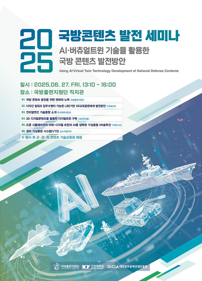 이번 세미나에서는 'AI·버츄얼트윈 기술을 활용한 국방 콘텐츠 발전방안'을 주제로 기술 기반 콘텐츠의 국방 분야 적용 가능성과 향후 추진 방향을 공유할 예정이다.
